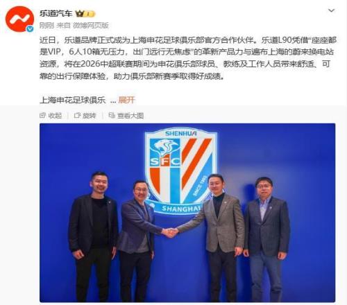 【CNMO科技消息】近日,乐道汽车官方宣布,正式成为上海申花足球俱乐部官方合作伙伴。乐道官方表示,L90凭借产品力与遍布上海的蔚来换电站资源,将在2026中超联赛期间为申花俱乐部球员、教练及工作人员带来舒适、可靠的出行保障体验,助力俱乐部新赛季取得好成绩。