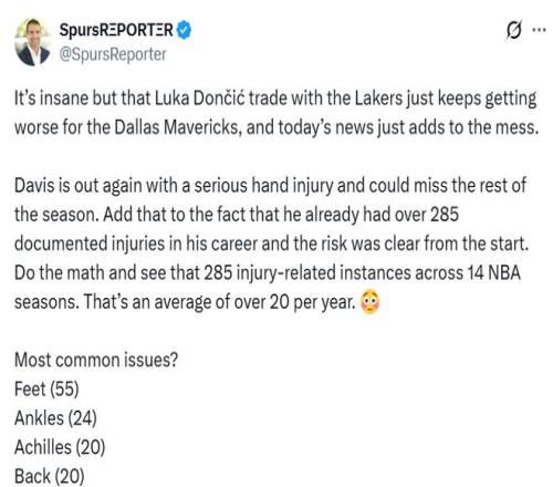 Garza表示:“戴维斯再度因左手严重伤势缺阵……他职业生涯中被记录在案的伤病已经超过285次,这笔交易的风险从一开始就显而易见。简单算笔账就知道,14个NBA赛季里出现285次伤病相关情况,平均每年超过20次。他最常见的伤病部位有哪些?脚部55次,脚踝24次,跟腱20次,背部20次。”