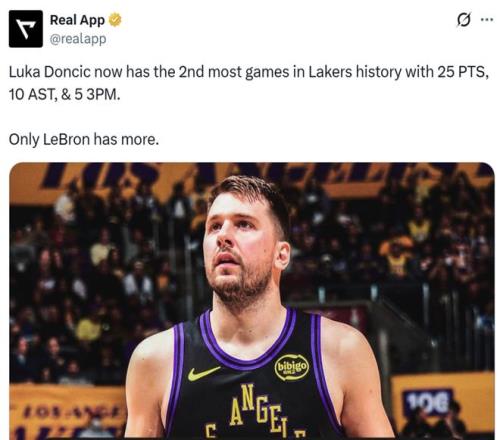 这是东契奇湖人生涯第3次单场拿下至少25+10助+5三分,已经升至队史第二名,仅次于詹姆斯的6次。