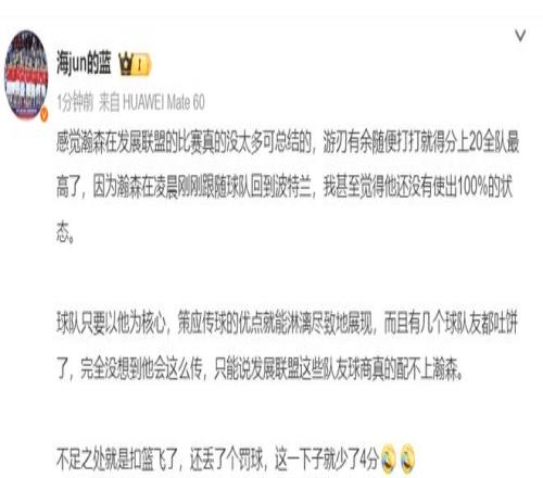 媒体人:感觉杨瀚森在G联赛没有太多可总结,比赛游刃有余得分上20全队最高,而且他还刚刚跟随开拓者从金州回到波特兰,我甚至觉得他都还没有100%发力。只要球队以他为核心就可以展示策应的优点,而且几个队友球商跟不上还连续吐饼。