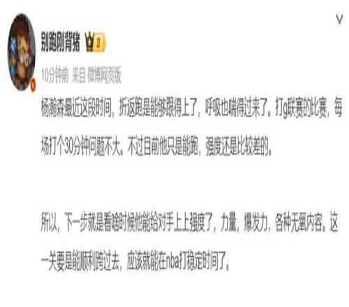 这场比赛国内的媒体人开始为小杨点赞,别跑刚背猪:杨瀚森这段时间折返跑跟得上了,呼吸也喘的过来。G联赛的比赛打30分钟不是问题,不过他的强度还是比较差,下一步就是提升强度,力量、爆发力各种无氧内容,这一关只要顺利跨过去,应该就可以在NBA打稳定时间。