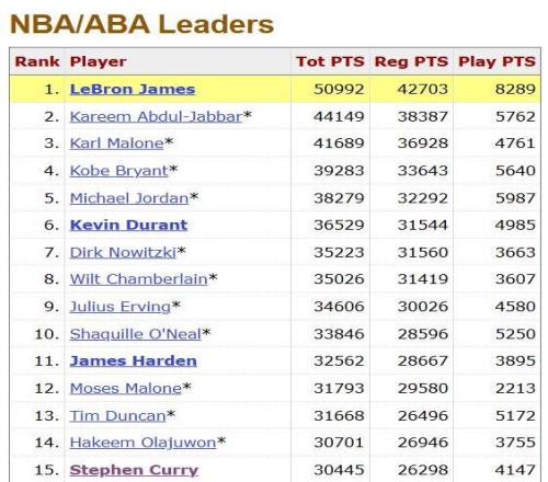 排在榜单第二位的是贾巴尔,目前詹姆斯已经领先他将近700分。现役第二名是杜兰特,他总得分为36529分(今日比赛未计入)。