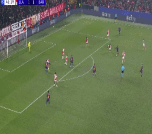第34分钟,德容直塞,费尔明小角度抽射破门,巴萨1-1布拉格斯拉维亚
